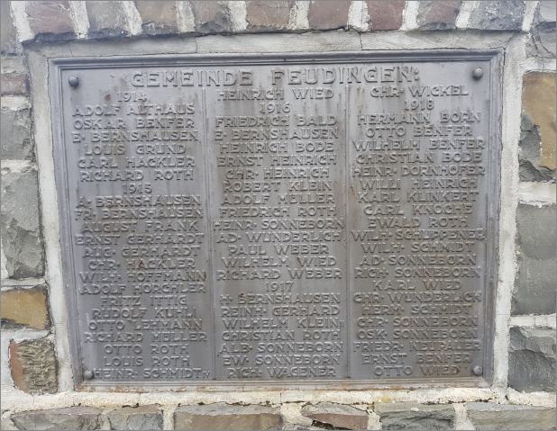 Die Bilder zeigen das Ehrenmal / Denkmal zum 1. Weltkrieg und die Gefallenen der Feudinger Ortschaften. Das Feudinger Ehrenmal ist ein besonderer Ort. Über eine Allee gelangt man zum Platz auf dem die Säule mit den Gedenktafeln steht. Überquert man den Platz gelangt man zu einer Mauer mit den Tafeln und Inschriften Gefallener und Vermisster im 2. Weltkrieg aus Feudingen. Das gesamte Gelände ist stets gepflegt und in hervorragendem Zustand.